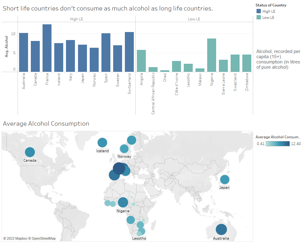 Countries with longer life expectancy showed that people had more years of education on average and their governments usually spent more on health. However, Sierra Leone was the exception and spent almost as much as Sweden, who ranked first in government spending. Another interesting find was that a good portion of countries with lower life expectancy also drank less alcohol than many countries with the longest lives.