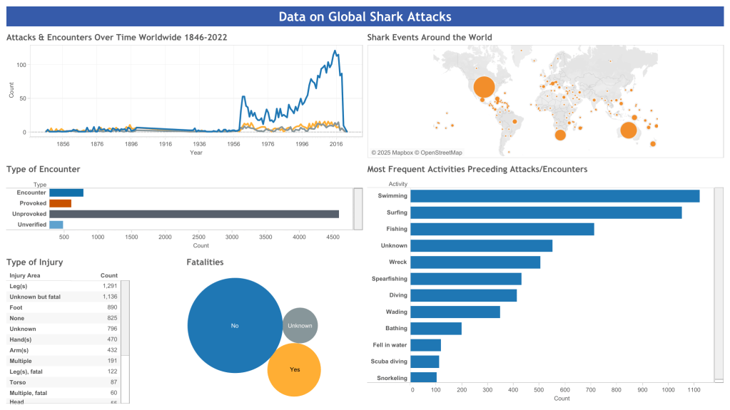I created an interactive dashboard using the Global Shark Attack File found on the Shark Research Institute’s website, sharks.org. The file is considered an incident log with descriptions of shark encounters and attacks from around the globe over thousands of years. After some cleaning and regrouping, I was able to create the dashboard in Power BI.