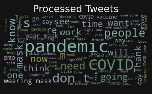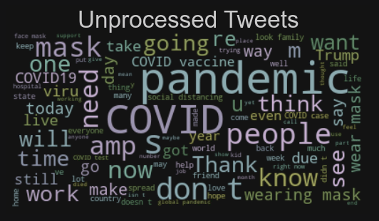 Using the Tweepy library, I extracted about 2.7 million tweets from Twitter’s API. Unfortunately, they had already removed their COVID-specific API, which would have made my query much easier. But I managed to extract tweets with relevant keywords and hashtags. Before sentiment analysis could begin, the tweets had to be preprocessed by removing stop-words (such as ‘and’, ‘the’, and ‘a’), lemmatizing, correcting spelling, and removing punctuation. Here are two wordclouds showing the most frequently used words before and after preprocessing.