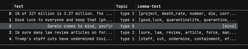 LDA or Latent Dirichlet Allocation is one of the most popular tools for this type of project, but it only assumes one topic per document. It was stated in a lot of articles I read that this might be a problem for micro-blogging platforms like Twitter. But I decided to try it anyway. The five topics shown below reveal that this caveat was spot on. The terms selected by the LDA model are rather ambiguous in both their grouping and their meaning. For example, in Topic 0, what do the words ‘business’, ‘big’, ‘vaccination’, ‘love’, and ‘tell’ work together to summarize a topic? In short, they don’t.