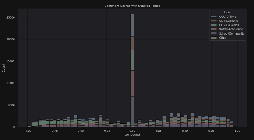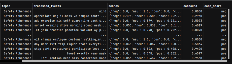 Usually sentiment analysis works to classify a document as positive, negative, or neutral. But VADER (Valence Aware Dictionary for Sentiment Reasoning) is also able to give a valence score for each term in the text and tell you how positive, negative, or neutral a document is after normalizing all scores in the text with a ‘compound score.’ In the sample of the data just below you can see the topic column followed by the cleaned version of the tweet. Then each term is scored by itself and then a compound score is assigned and I added a categorical version of that compound score to assign the result as either ‘pos’, ‘neg’, or ‘neu.’
