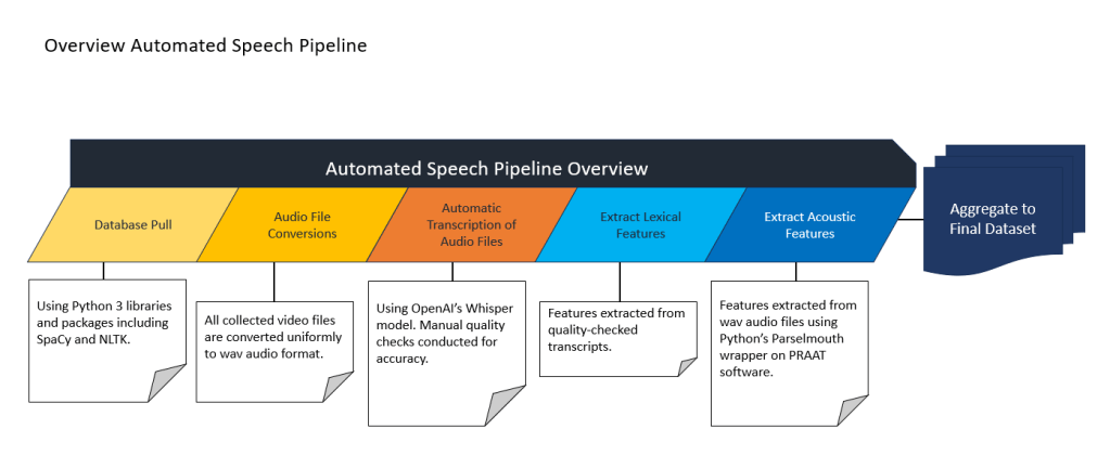 Together we spent the next two years designing and crafting an automatic speech pipeline in Python. As the main programmer for this project, I coded a pipeline that began with processing digital audio recordings of cognitive assessments for automatic transcription and analysis with various natural language processing and computational tools. In this way, we were able to extract both linguistic and acoustic measures from the audio and matching transcripts. The resulting dataset provided a wealth of knowledge for each participant in terms of their speech and language use. Some such informative features included pause rate, noun-to-verb ratio, and average syllable pause duration, and the pipeline can extract over 100 features today. Such measures allow researchers to note differences between different dementia variants and also track the progression of a patient’s disease by changes in their speech metrics between assessments. I was very proud that our work resulted in a publication in Neurology and this work has continued to be used in new projects by Dr. Vonk and her colleagues.